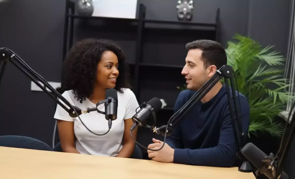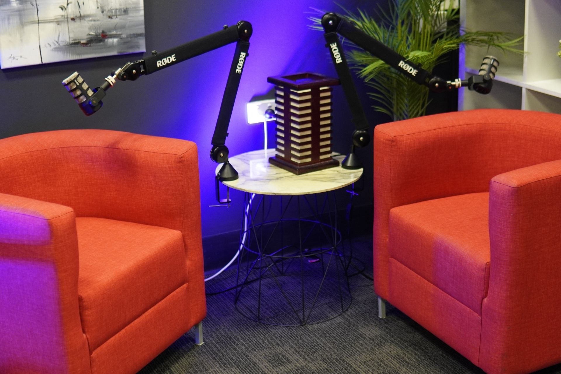 Multiple set options – from clean, modern podcast setups to more relaxed conversational layouts.